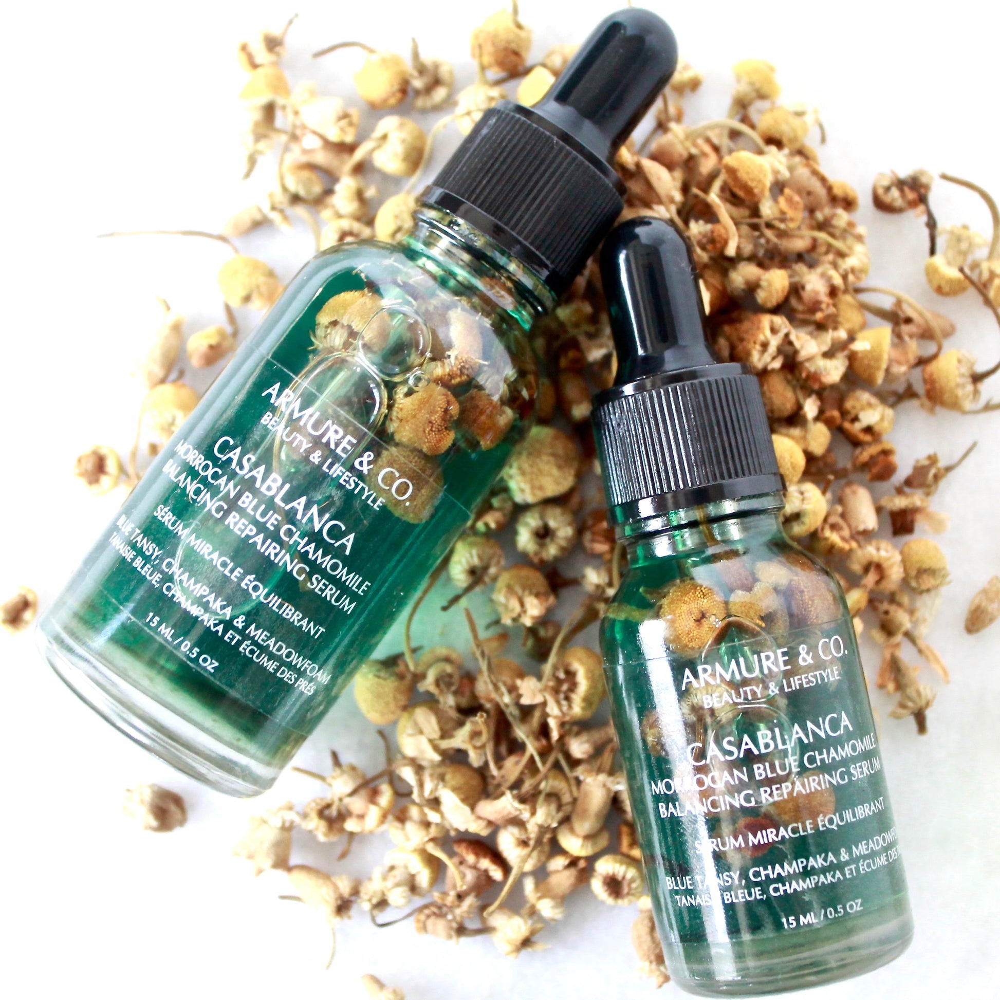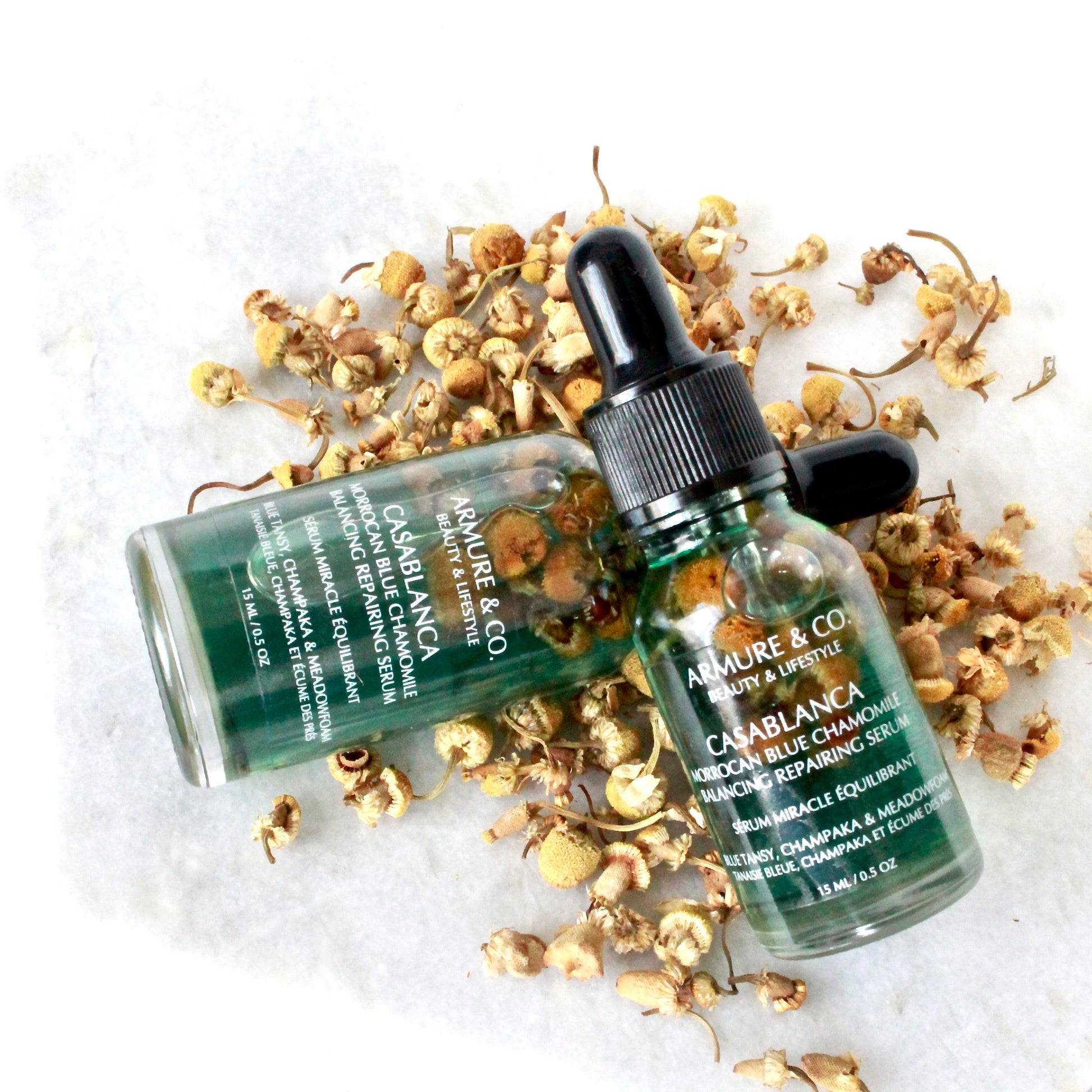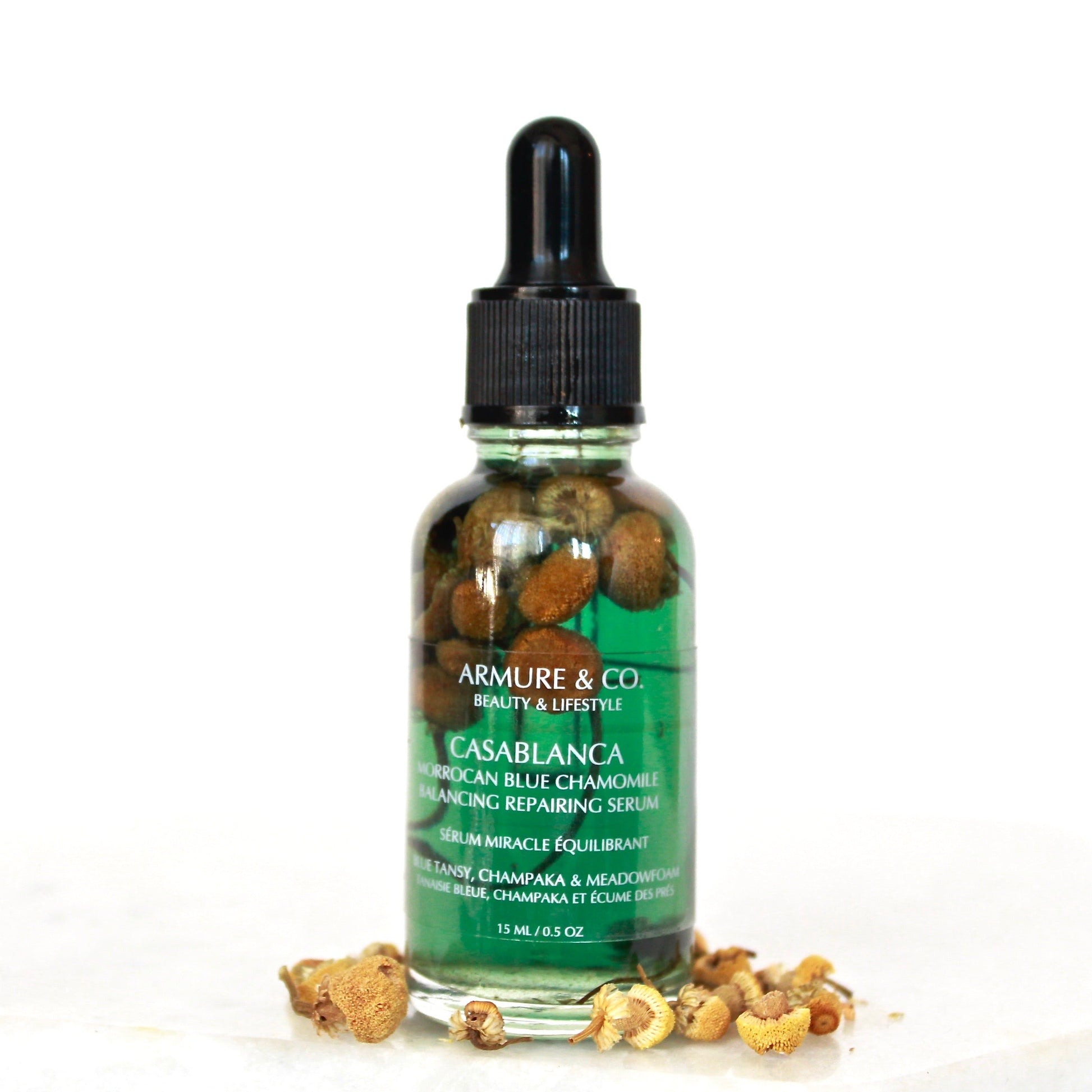 Casablanca is a unique ultra-soothing and healing face serum. Made with distilled "Moroccan Chamomile" known as Blue Tansy. This serum is great for anyone who has bouts of angry irritated skin. The properties in this serum are all-star for their anti-inflammatory, anti-fungal, and anti-bacterial properties. Casablanca can help skin rashes, irritations, bug bites, eczema, dermatitis, and acne feel soothe and tranquilized while providing moisture for dry skin.