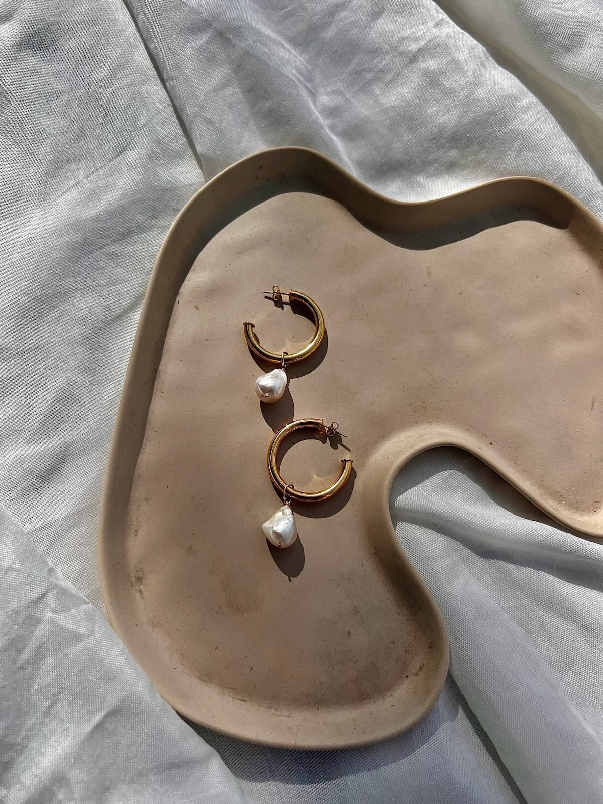 A timeless pair with a touch of natural beauty. These small-to-medium gold-fill hoops feature delicate, irregular mother-of-pearl charms that catch the light with every movement. Perfect for elevating your everyday look or adding an organic, coastal vibe to your evening outfit.