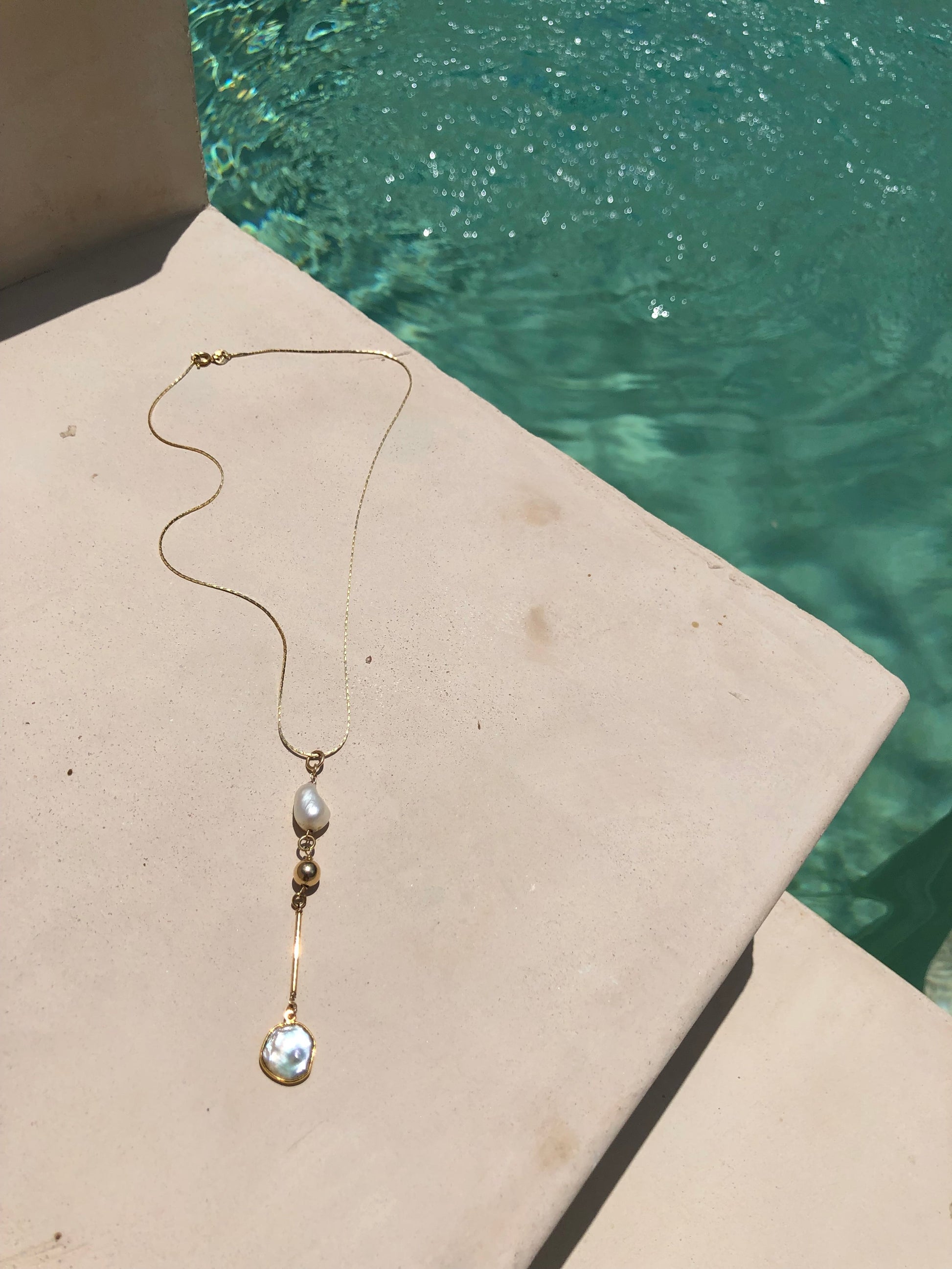 Playful shapes with a sexy silhouette, makes this one a favorite. This beauty is the perfect necklace for any occasion, assorted pearls with 14 gold fill.