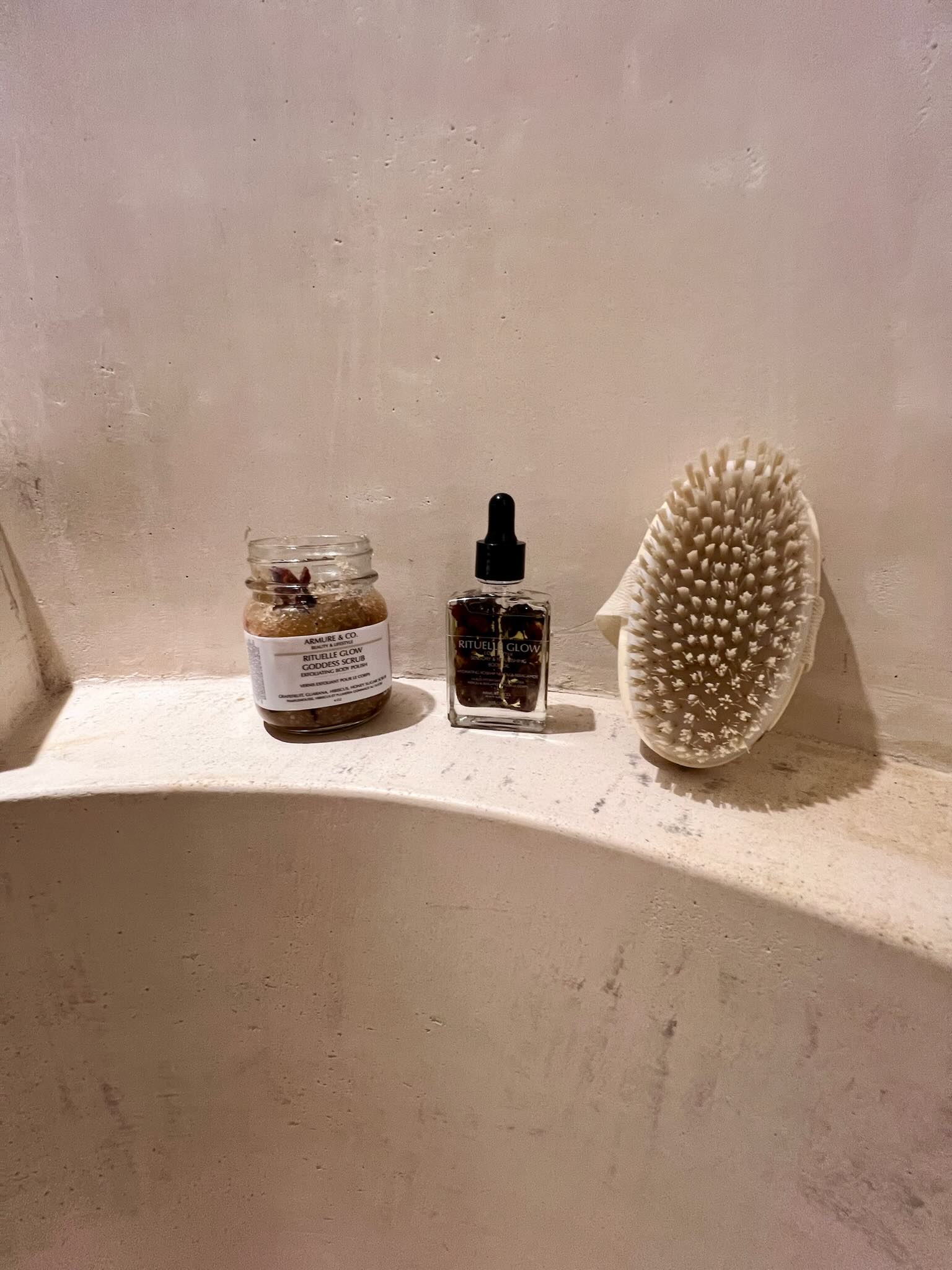 The Rituelle Glow Trio features the bestselling Rituelle Glow oil, renowned for its skin-smoothing and beautifying effects that leave you radiant. Complemented by the Rituelle Glow Hibiscus body scrub and the Rituelle Bath Tea—infused with rosehips, hibiscus, citrus, and sea salts—this set revitalizes your skin and senses. The glow oil, crafted with nourishing seed oils like rosehip, pomegranate, and camellia, promotes a calming ritual while helping diminish scars and stretch marks. Together, these products create a holistic self-care experience that enhances your skin’s natural luminosity and wellbeing.Get a free body brush with this set to take your glow to the next level!